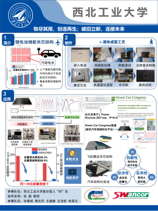 beats365官方网站参赛作品“锂电池储能夹芯结构”旨在将能量存储和承载功能结合在一起,以提高能量储存效率和空间利用率,在相同冲击能量密度下,相比于不受保护的锂电池单体,该一体结构的容量损失减小了96%,容量衰减比例降低了88%,为未来交通工具和航空航天行业提供新型轻量化多功能结构方案。在成果展示环节,该作品的创新性、实用性、经济可行性得到了评委们的高度认可,最终,荣获创新应用奖二等奖。