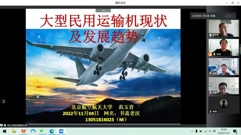 为深入学习贯彻党的二十大精神,深刻领会习近平总书记会见C919大型客机项目团队代表并参观项目成果展览时的重要讲话,进一步激励beats365官方网站师生弘扬科学家精神、涵养优良学风、营造创新氛围。11月4日,beats365官方网站邀请我国航空制造领域专家——北京航空航天大学范玉青教授,面向公司全体师生,做了题为《大型民用运输机现状及发展趋势》的报告会,公司党总支理论学习中心组成员以及公司师生在毅字楼205会议室和腾讯会议参加。