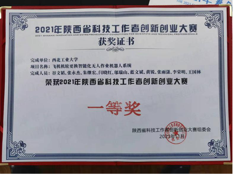 《飞机机轮更换智能化无人作业机器人系统》,作品完成人——谷文韬、张永杰、朱继宏、闫晓红、邬瑞山、蓝文斌、黄锐、张雨潇、李荣明、王国林。