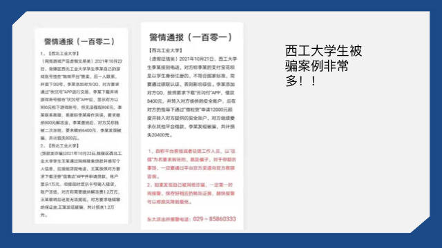 首先,2019级本科生辅导员张猛创老师向大家讲述了几类最近真实发生在校园里同学们身上的电信诈骗案件:1冒充公安检法人员类:诈骗人员冒充公安机关人员,以同学们违法犯罪为由,进行恐吓,威胁从而达到同学们转钱的目的;2冒充领导、熟人类:通过盗取社交软件账号的方式冒充熟人借钱。3网络游戏产品虚假交易类:以出售游戏装备、游戏账号为由骗取钱财。