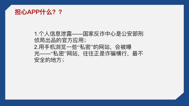 最后,张猛创老师还像向大家介绍了“防电信、网络诈骗”强而有力的软件——国家反诈中心APP。张老师从软件的具体功能、工作方式以及自己的亲身经历等,向同学们详细介绍了国家反诈中心APP的作用,呼吁大家一定要按要求安装,保护自己的财产安全。