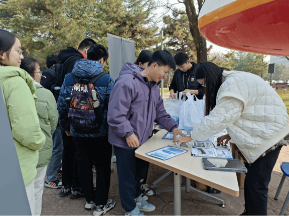 火热的现场吸引了许多路人驻足观看,有几位路过的老师在国际民航日的科普展板前细细查看;一些小朋友被明信片吸引过来,离开时还说着“以后我也要设计大飞机”;还有几位外国友人注意到了展板上的“International Civil Aviation Day”与志愿者们深入交流活动详情。