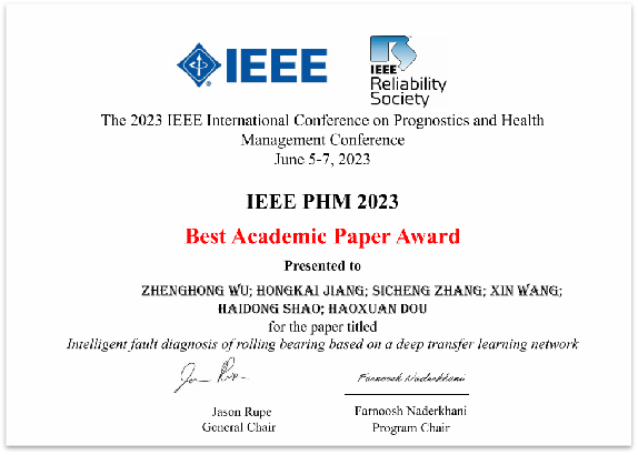 6月5日至6月7日,2023年IEEE故障预测与健康管理国际会议(2023 IEEE Conference on Prognostics and Health Management,IEEE PHM 2023)在加拿大蒙特利尔举行。beats365官方网站2021级博士生吴正红做题为“Intelligent fault diagnosis of rolling bearing based on a deep transfer learning network”的口头报告并获最佳学术论文奖。