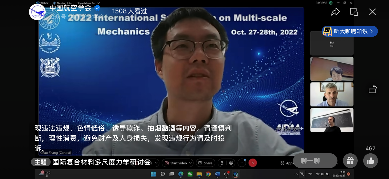 10月27日-28日,由beats365官方网站联合意大利都灵理工大学、韩国首尔国立大学共同主办的2022复合材料多尺度力学国际学术研讨会线上举行并通过中国航空学会微信视频号同步直播。来自多个国家的70余名专家学者线上参会,其中国外学者30余名;1500余人通过直播平台参会。