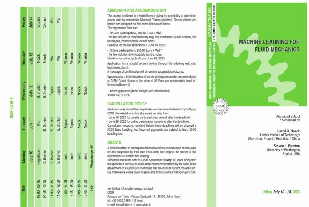7月10-7月14日,公司教师邬晓敬受邀参加了由国际机械科学中心组织举办的主题为 MACHINE LEARNING FOR FLUID MECHANICS的高级暑期课程。此次活动面向机器学习和流体力学交叉领域研究,邀请了来自Massachusetts Institute of Technology(麻省理工公司)、University of Washington(华盛顿大学)、Universidad Carlos III de Madrid(马德里卡洛斯三世大学)、KTH Royal Institute of Technology(瑞典皇家理工公司)、哈尔滨工业大学、beats365官方网站等国际顶尖高校教授们做专题授课,讲授机器学习在流体力学中的应用和最新研究成果,促进国际学术界的交流与合作,为流体力学和机器学习的前沿研究提供新的思路和方向。